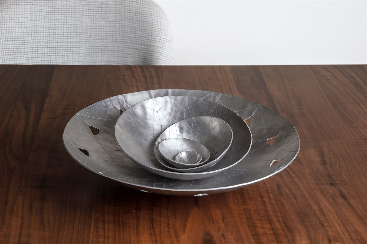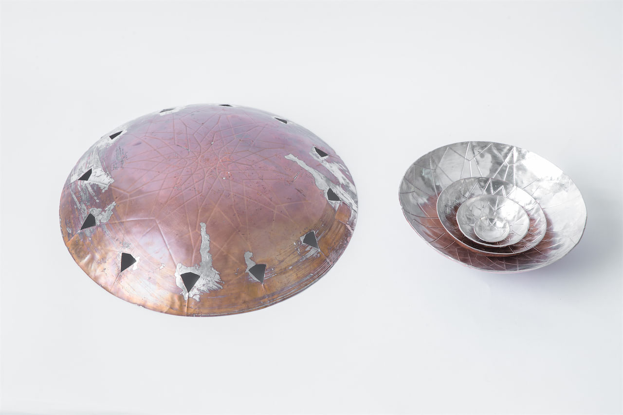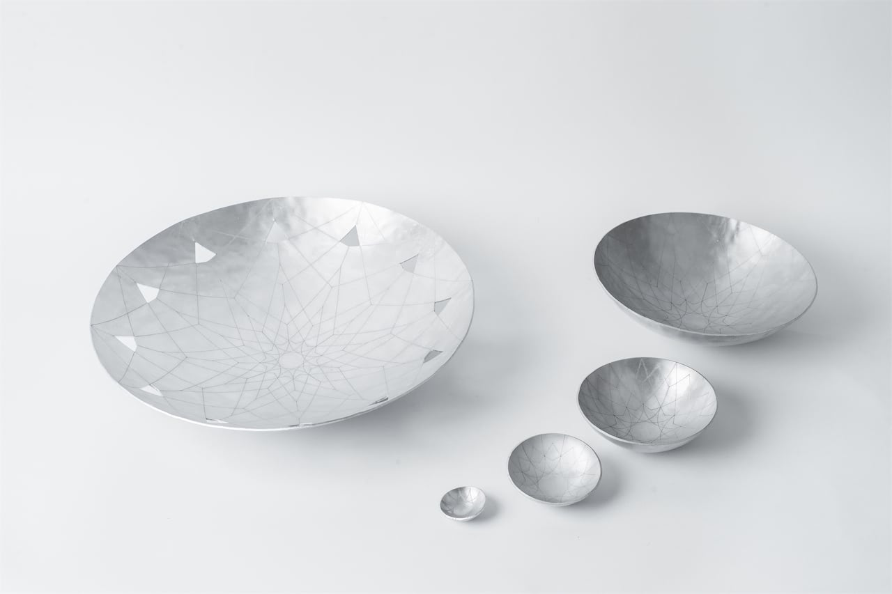 The set of five bowls focuses on a modern form of utility and experiential dining – a take on the utilitarian nature of the historic Saffar vessels. The single line pattern is intended as a critique of superficial appropriation of Islamic geometry. Based on the essential golden ratio and islamic geometry, it is used as a guide for the craftsmen to hammer in circles, which necessitates the concentric grid. The set contrasts dish sizes to compliment Western and Eastern, shared and individual servings, rather than just western standards. A true reflection of our amalgamated modern culture in Kuwait.