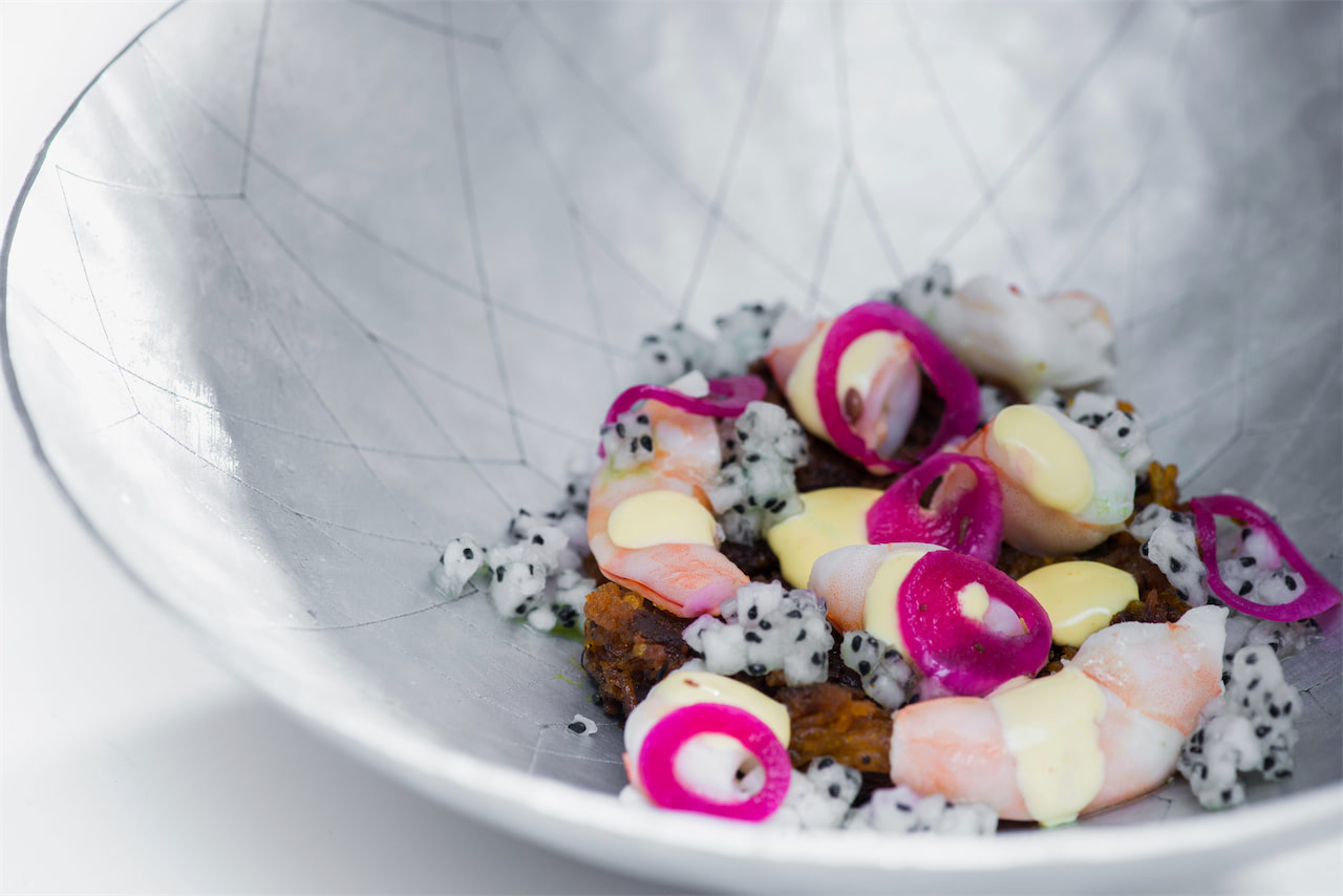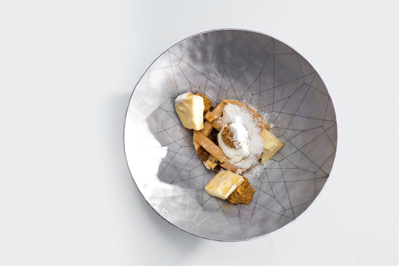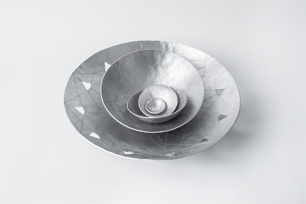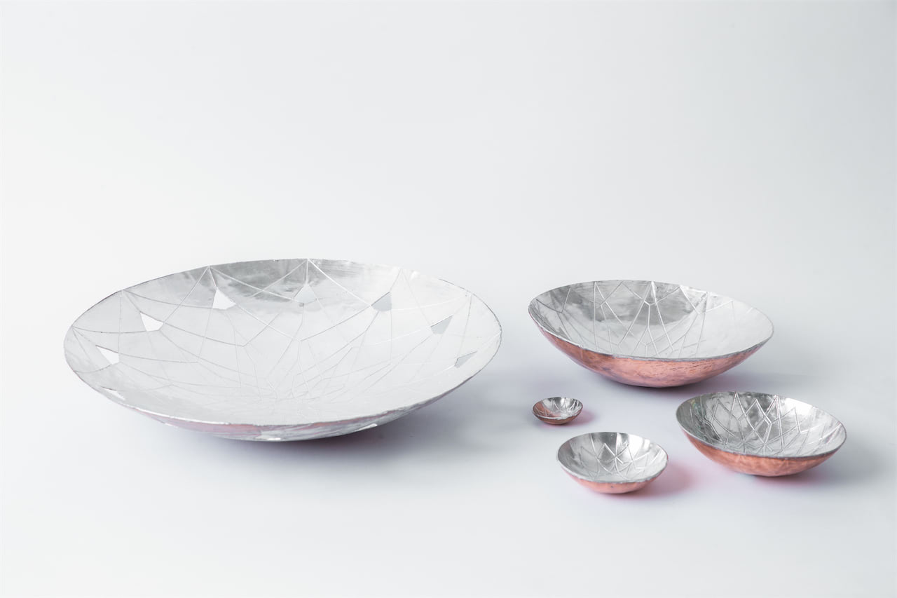 The set of five bowls focuses on a modern form of utility and experiential dining – a take on the utilitarian nature of the historic Saffar vessels. The single line pattern is intended as a critique of superficial appropriation of Islamic geometry. Based on the essential golden ratio and islamic geometry, it is used as a guide for the craftsmen to hammer in circles, which necessitates the concentric grid. The set contrasts dish sizes to compliment Western and Eastern, shared and individual servings, rather than just western standards. A true reflection of our amalgamated modern culture in Kuwait.